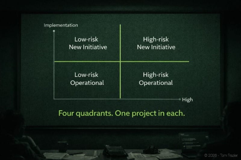 It forces cross-functional exposure. One project per quadrant almost guarantees you'll touch multiple teams — operations, risk, product, customer. AI adoption doesn't happen in a single department. It spreads from successful implementations. Four projects running at once means four different pockets of the organization are developing firsthand experience at the same time.