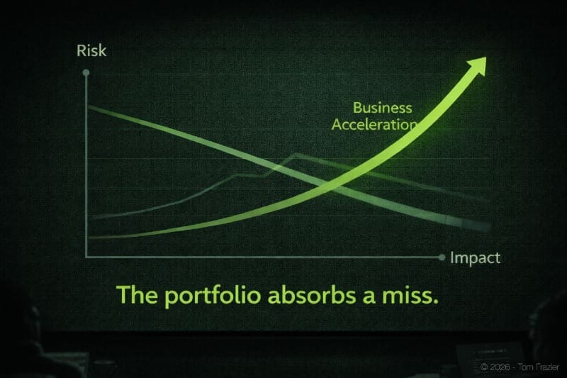 It structures survivable failure. Not all four will work. That's expected. Intelligence is hard. The portfolio absorbs a miss. If the high-risk initiative stalls, the efficiency project is probably already paying back. The business doesn't bet its credibility on a single outcome.