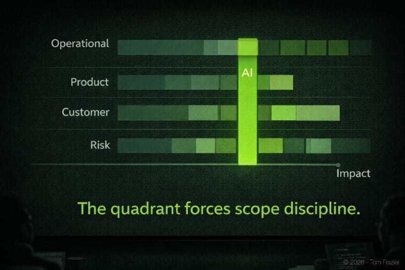 Where does the business carry meaningful downside exposure in its normal operations — places where things go wrong and when they do, it's expensive or damaging? The goal here isn't cost reduction. It's improving reliability in something that already matters. This quadrant is defined by what's at stake in the business, not by implementation complexity.