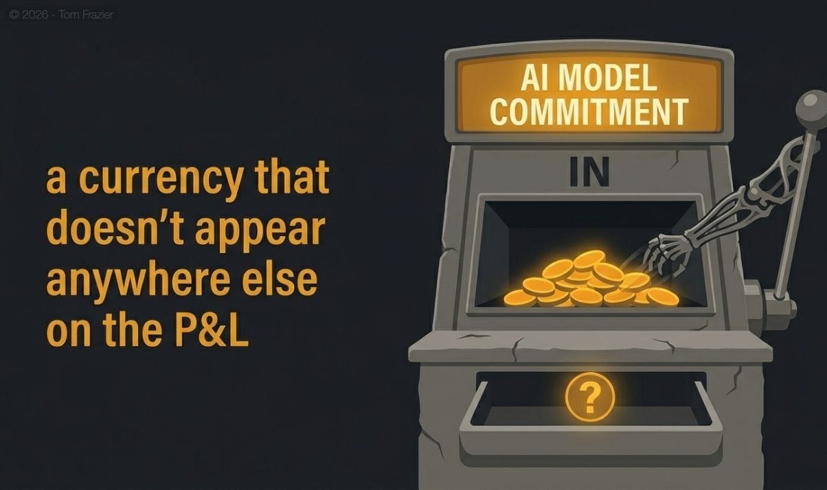 - Commitment discipline. Frontier model contracts and cloud AI commitments should go through the same scrutiny as any major infrastructure commitment. The fact that they're priced in tokens rather than servers doesn't make them less of a multi-year financial commitment.